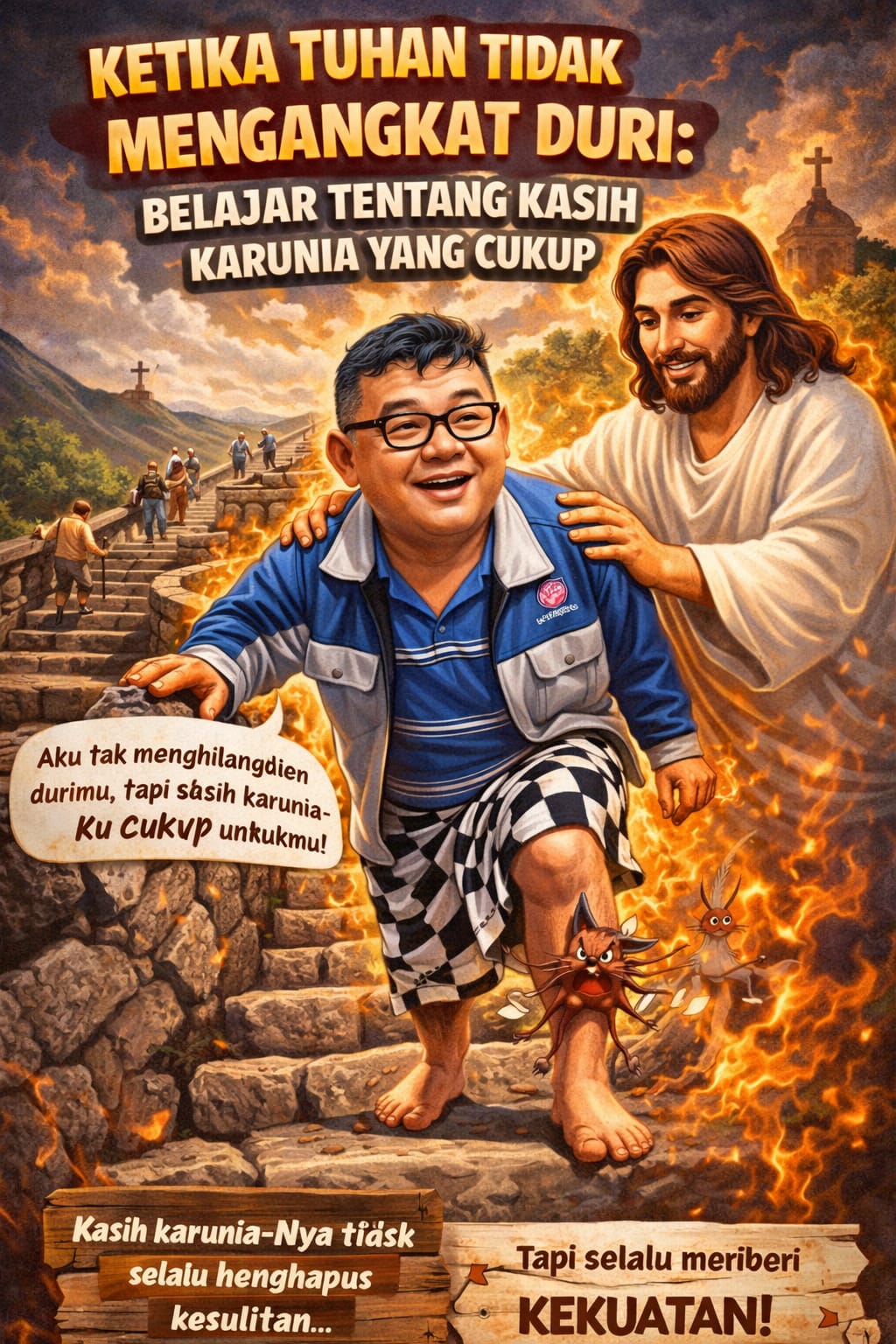 Kasih karunia sering kali disalahartikan sebagai jalan keluar dari penderitaan. Padahal kasih karunia adalah kehadiran dan pertolongan Allah di tengah penderitaan. Ia bukan selalu mengubah situasi, tetapi selalu mengubah hati.